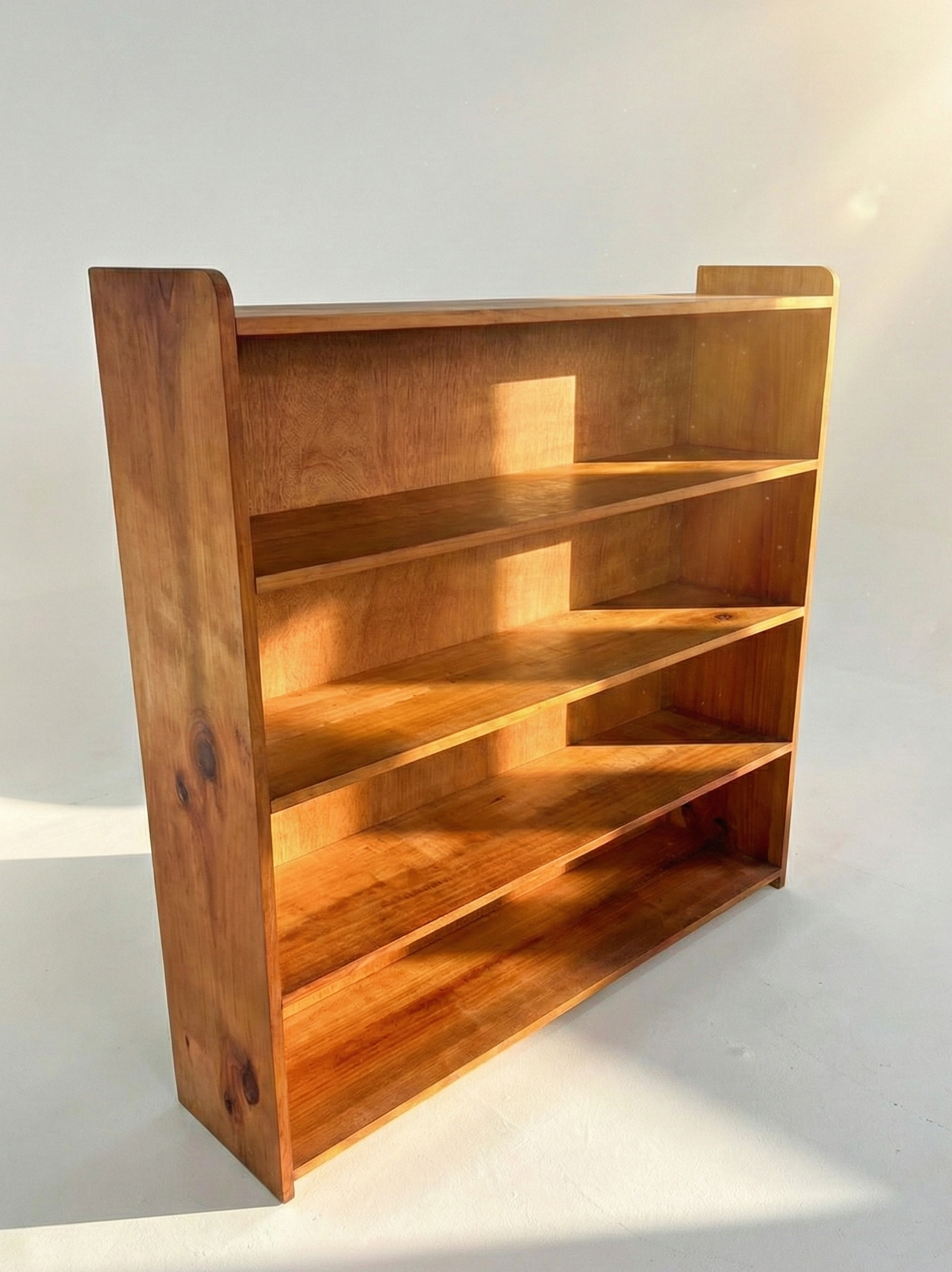 A Mid-Century Modern (MCM) bookcase, crafted from solid pine. The side panels extend slightly above the top shelf and feature rounded front corners. This is a classic "waterfall" design element popular from the late 1930s through the 1950s.