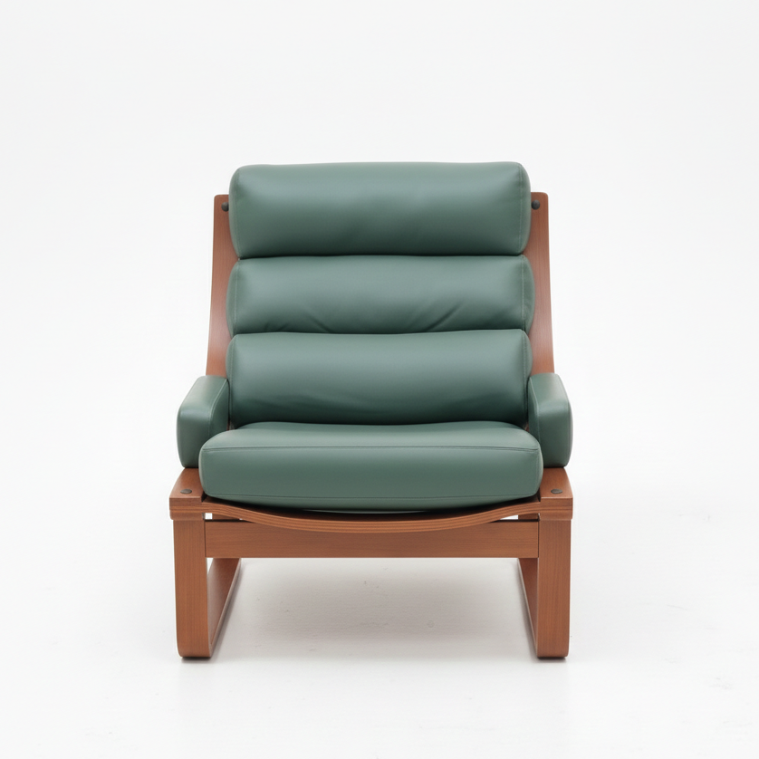 Introducing the award-winning and iconic Tessa T4 armchair, designed by Fred Lowen and crafted from teak veneer and solid timber. Enjoy the comfort of the unique nets which contour to your body shape, while the cushions provide both style and support. This has recently been recovered in premium sage green leather.
