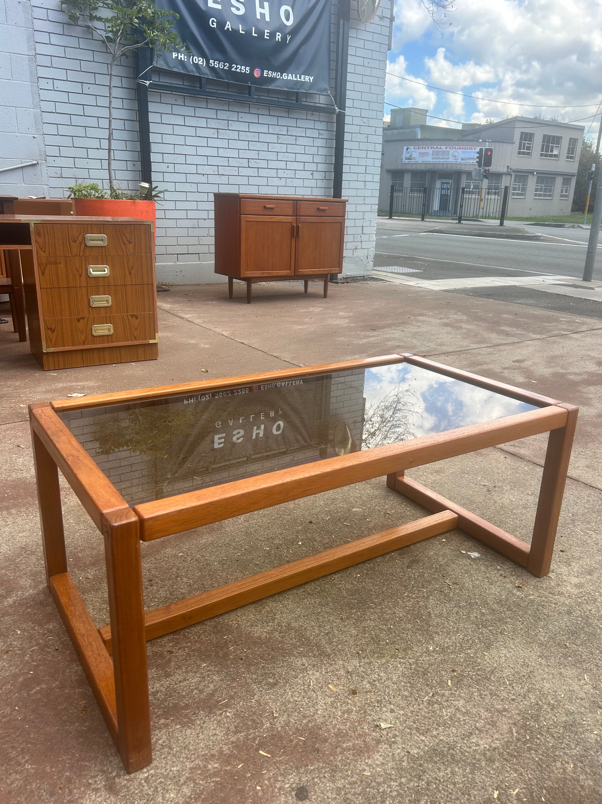 Parker mid century teak table smokey glass 1970s